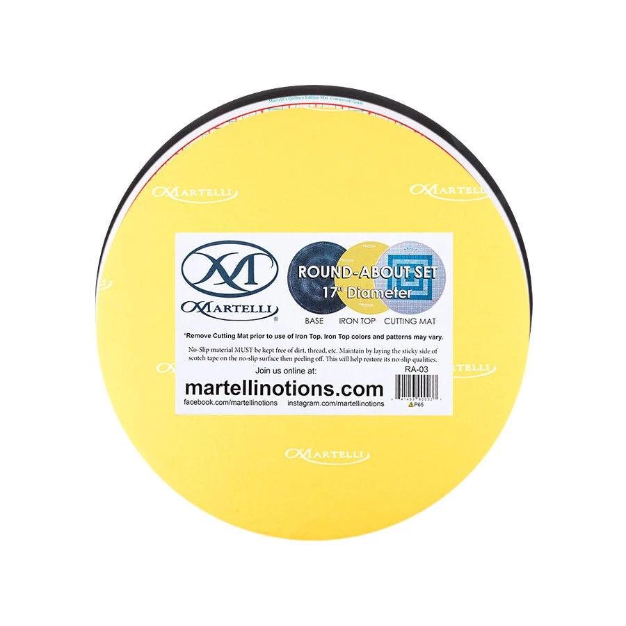 Martelli’s 17″ Round-About Set is great for cutting, pressing and piecing. It features a 17″ diameter Round-About ball bearing base that rotates 360 degrees with removable cutting mat and ironing tops.