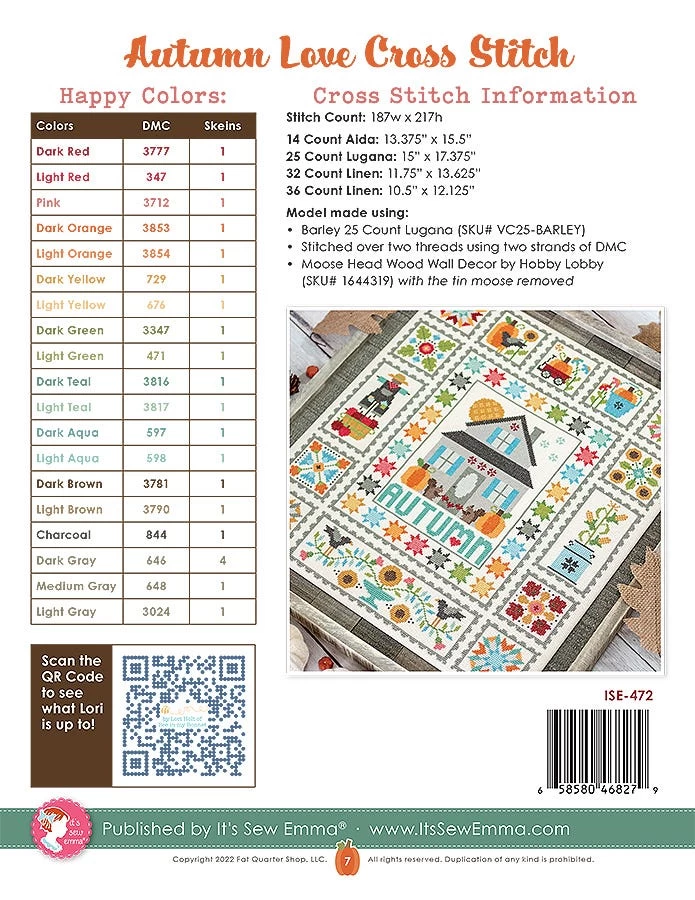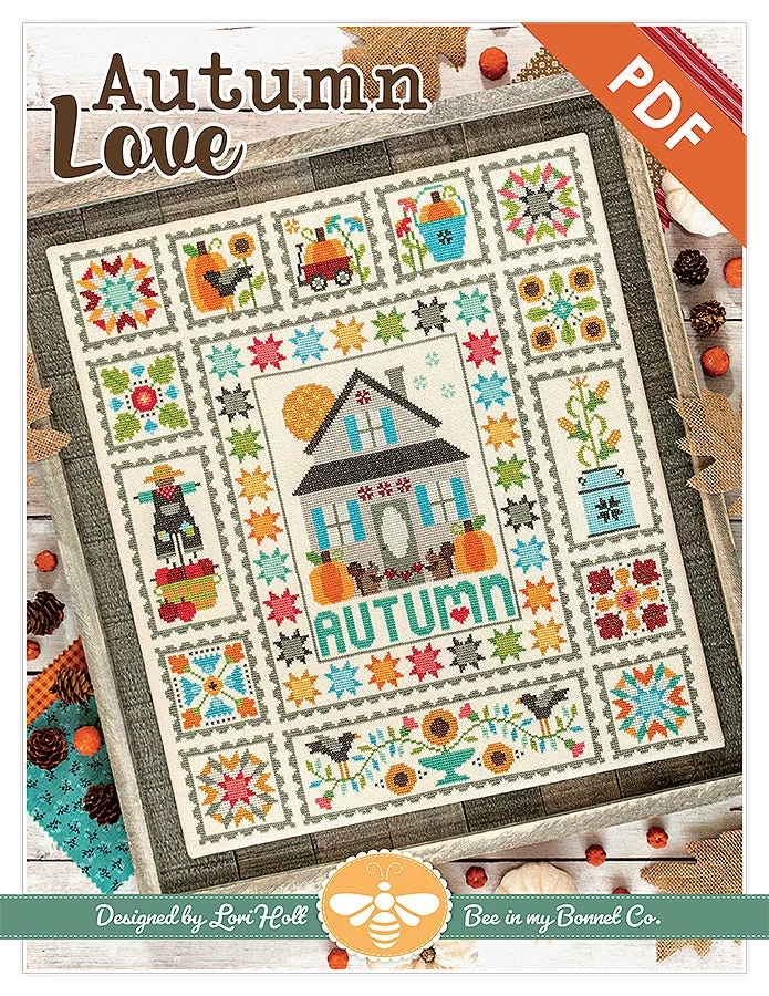 The Autumn Love Cross Stitch Pattern comes with full-color instructions, diagrams and supply list, including suggested DMC colors. It is printed on durable 8.5” x 11” cardstock. The cross stitch is designed to work on 25-count cloth and finishes at 15” x 17.375”.