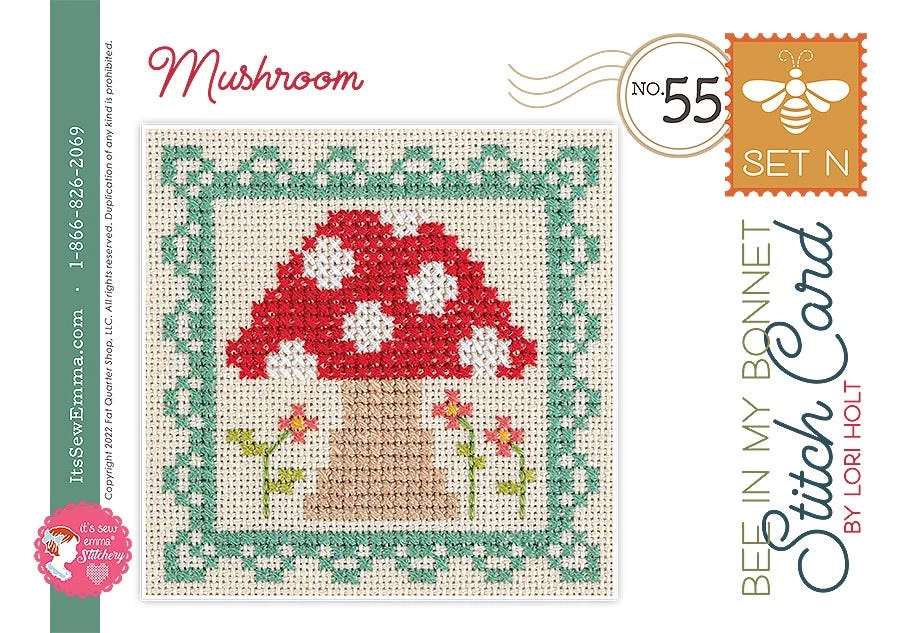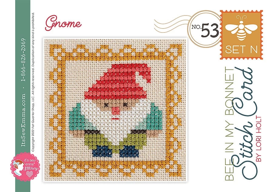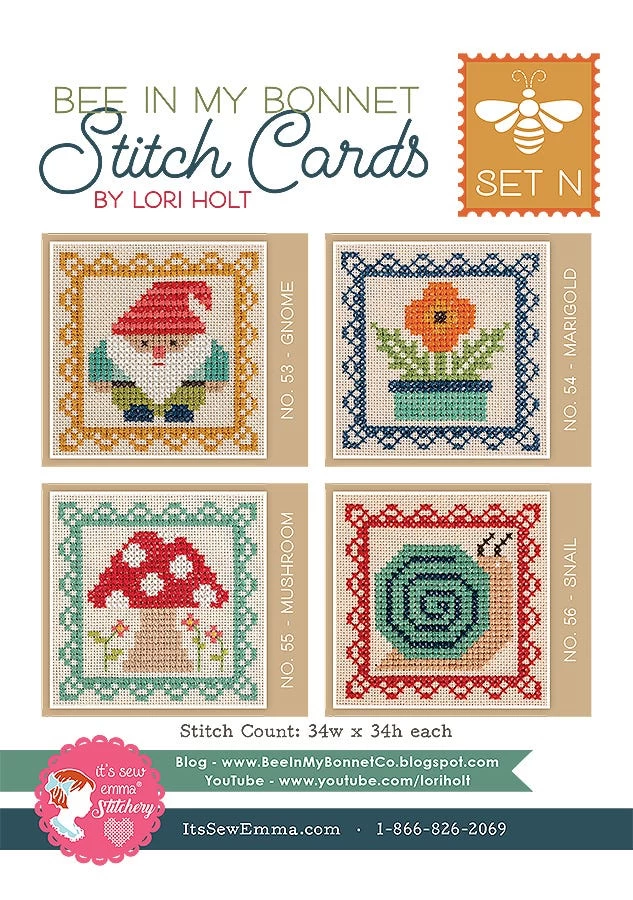 The Bee in My Bonnet Stitch Cards come with full-color instructions, diagrams and supply list, including suggested DMC colors. Each set includes four stitch cards printed on durable cardstock and comes in a plastic bag.