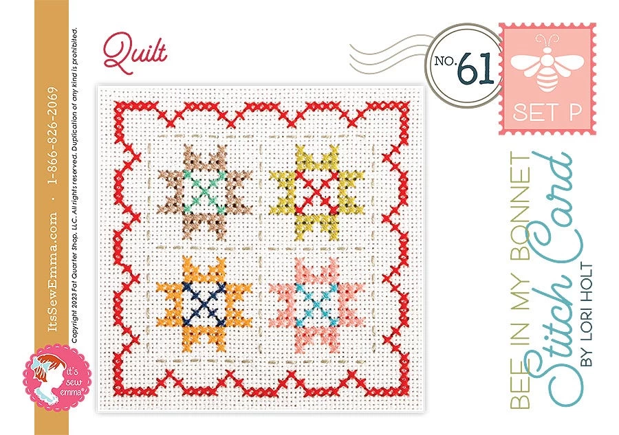 The Bee in My Bonnet Stitch Cards come with full-color instructions, diagrams and supply list, including suggested DMC colors. Each set includes four stitch cards printed on durable cardstock and comes in a plastic bag.