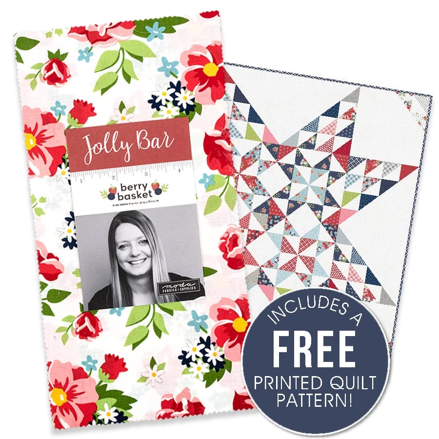 Berry Basket Jolly Bar includes 42 5" x 10" cuts of fabric and includes duplicates of some prints. <br><br>Includes a free pattern to make the 64.5" x 64.5" quilt. <br><br>Fabric requirements for Berrylicious Jolly Bar Pattern:<BR><ul class="prod-desc-bullet-list"> <li>One Berry Basket Jolly Bar – SKU# 24150JB</li> <li>3.125 yards background – SKU# 24154-11</li> <li>0.75 yards binding – SKU# 24155-14</li> <li>4.25 yards backing – SKU# 24150-11</li> </ul> <br><br> Pick the very best fruit with this collection by designer <a tabindex="0" href="https://www.fatquartershop.com/april-rosenthal-prairie-grass-patterns-moda-fabrics">April Rosenthal</a>. <a href="https://www.fatquartershop.com/moda-fabrics/favorite-things-sherri-and-chelsi-moda-fabrics">Berry Basket</a> is a very <a tabindex="0" href="https://www.fatquartershop.com/food-fabrics">berry</a> sweet selection of fabrics full of fun and bright colors, with designs of flourishing <a tabindex="0" href="https://www.fatquartershop.com/floral-fabric">florals</a> and sweet treats! Pair these prints with the coordinating <a tabindex="0" title="Bella Cottons Solids" href="https://www.fatquartershop.com/moda-fabrics/bella-solids-moda-fabrics-quilting-fabrics">Bella Cottons Solids</a> from <a tabindex="0" title="Moda Fabrics" href="https://www.fatquartershop.com/moda-fabrics">Moda Fabrics</a> to create some wonderful projects!