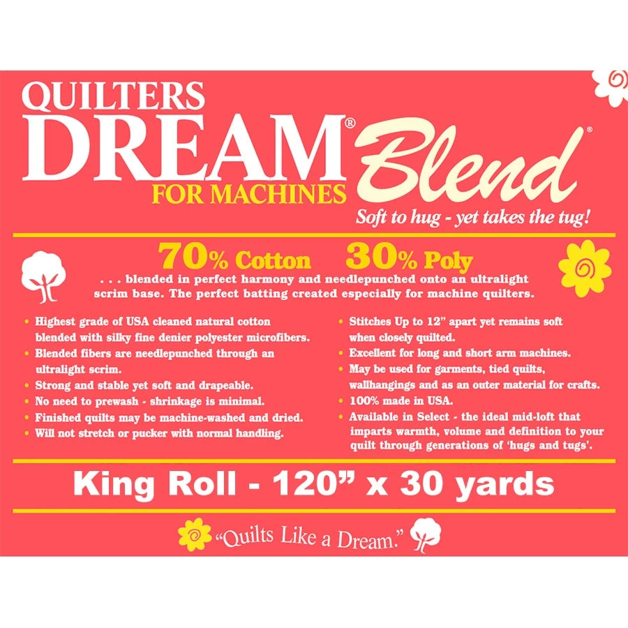 Blend for Machines Batting by Quilter's DreamFeatures:70% cotton and 30% polyester with Ultra-Light scrim baseNo need to prewash. Shrinkage is minimal.Stitches up to 12" apart yet remains soft when closely quiltedExcellent for long and short arm machines100% made in the USASize: 120" x 25 yardsShipping note: This product ships separately from a third party, typically in 5-10 business days. Item cannot be shipped to P.O. boxes, Hawaii, Alaska or outside the contiguous U.S. Also, it cannot be shipped internationally. Not eligible for express shipping.