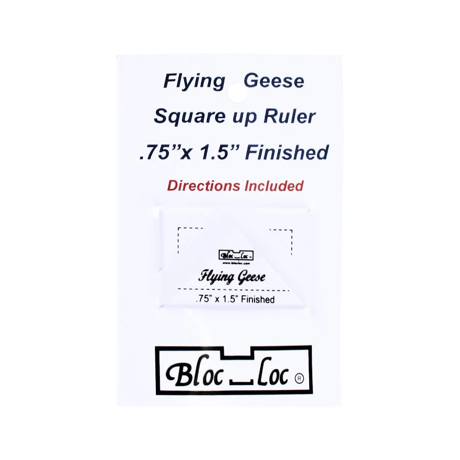 Flying Geese Square Up Ruler from Bloc_Loc eliminates most, if not all of your Flying Geese errors, quickly and easily. The patent pending channel locks onto both seam allowances and slides to square up your Flying Geese. It works on all Flying Geese block methods, so you will never take the top off a Goose again. This ruler makes a finished .75″ x 1.5″ flying geese block and includes easy to follow instructions.