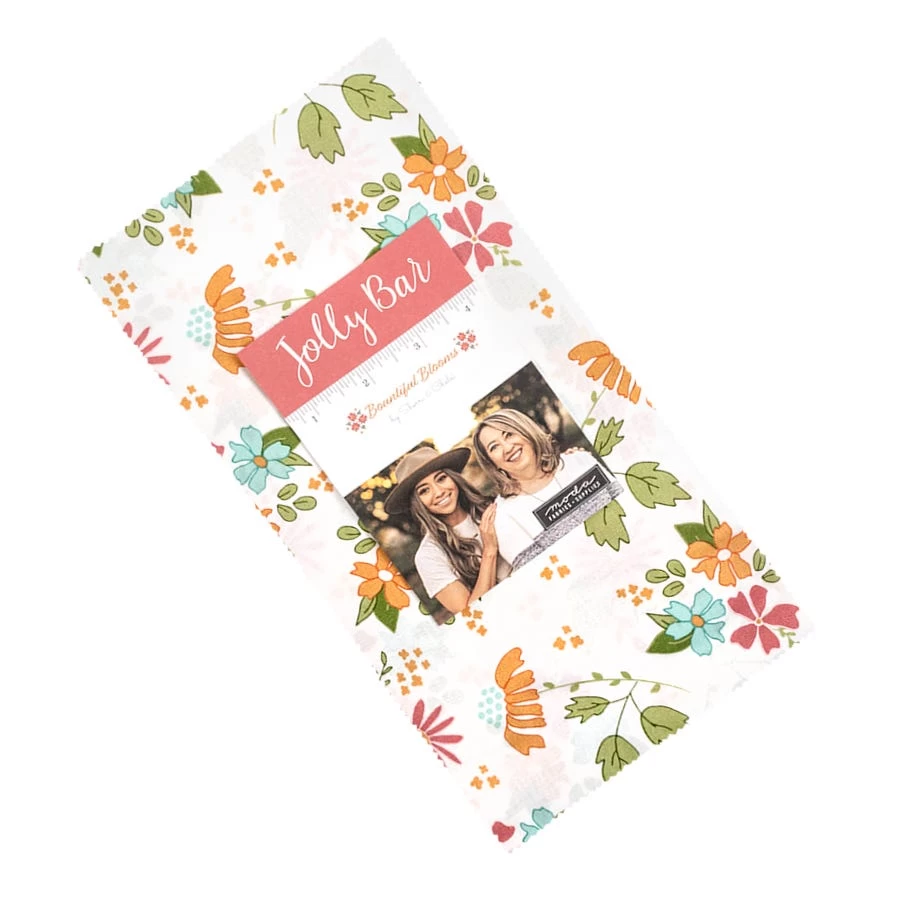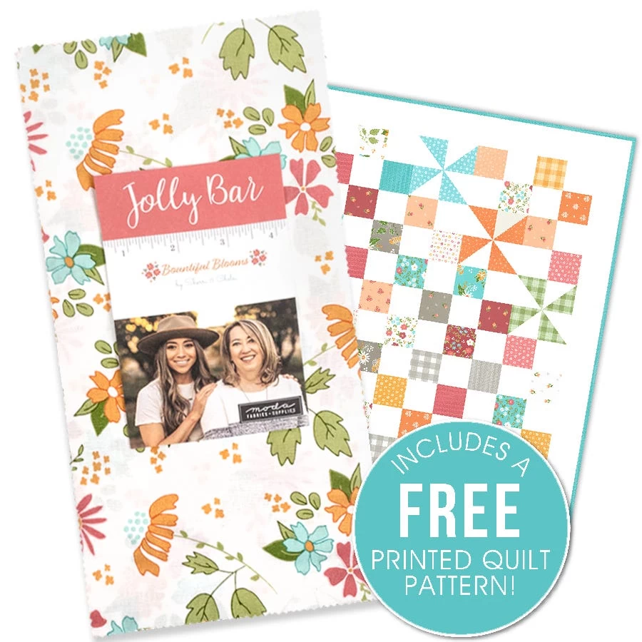 Bountiful Blooms Jolly Bar includes 42 5" x 10" cuts of fabric and includes duplicates of some prints <br><br>Includes a free pattern to make the 56.5" x 56.5" quilt <br><br>Fabric requirements for Pinwheel Surprise Jolly Bar Pattern:<BR><ul class="prod-desc-bullet-list"> <li>One Bountiful Blooms Jolly Bar – SKU# 37660JB</li> <li>2.25 yards background – SKU# 37668-21</li> <li>0.625 yards binding – SKU# 37667-18</li> <li>3.75 yards backing – SKU# 37663-11</li> </ul> <br><br> With blooms of plenty and radiating hues, this collection by designers <a tabindex="0" href="https://www.fatquartershop.com/sherri-and-chelsi-for-moda-fabrics">Sherri & Chelsi</a> is sure to bring a smile to your face. <a href="https://www.fatquartershop.com/moda-fabrics/bountiful-blooms-sherri-and-chelsi-moda-fabrics">Bountiful Blooms</a> is filled to the brim with blossoming <a tabindex="0" href="https://www.fatquartershop.com/floral-fabric">florals</a> and lovely plaid patterns. Pair these prints with the coordinating <a tabindex="0" title="Bella Cottons Solids" href="https://www.fatquartershop.com/moda-fabrics/bella-solids-moda-fabrics-quilting-fabrics">Bella Cottons Solids</a> from <a tabindex="0" title="Moda Fabrics" href="https://www.fatquartershop.com/moda-fabrics">Moda Fabrics</a> for some bright projects!