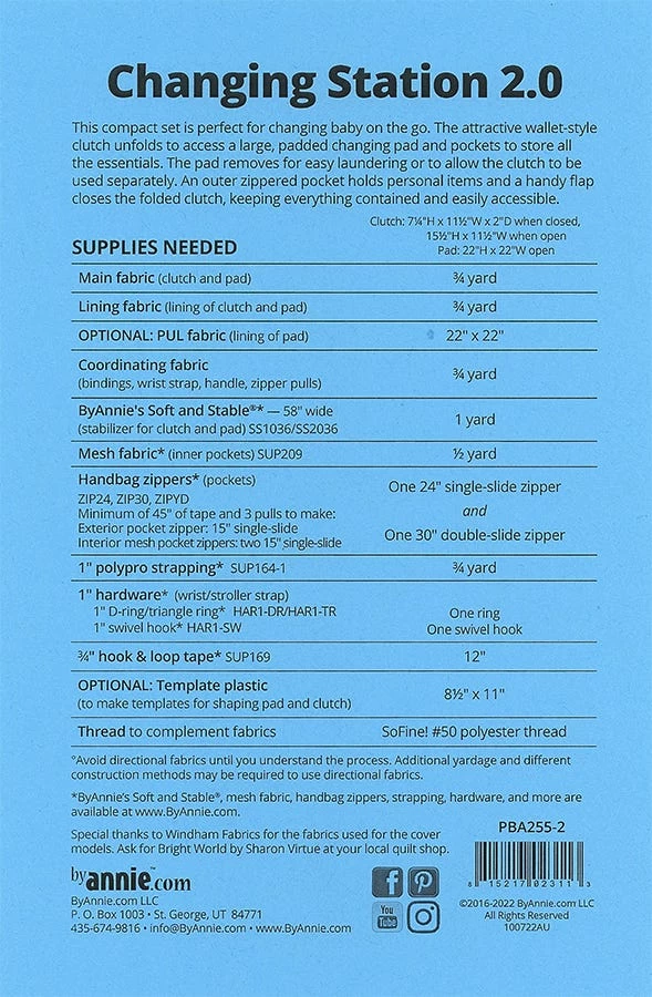 Changing Station 2.0 Diaper Clutch and Changing Pad Sewing Pattern crafts the perfect solution to any new parent's most essential need. This attractive clutch style set will allow you to change baby on the go and provide storage space for other small essential items.<br><br> Finished sizes:<BR><br> Clutch:<br> Closed – 2" x 7.25" x 11.5"<BR> Open – 11.5" x 15.5"<br><br> Pad – 22" x 22"