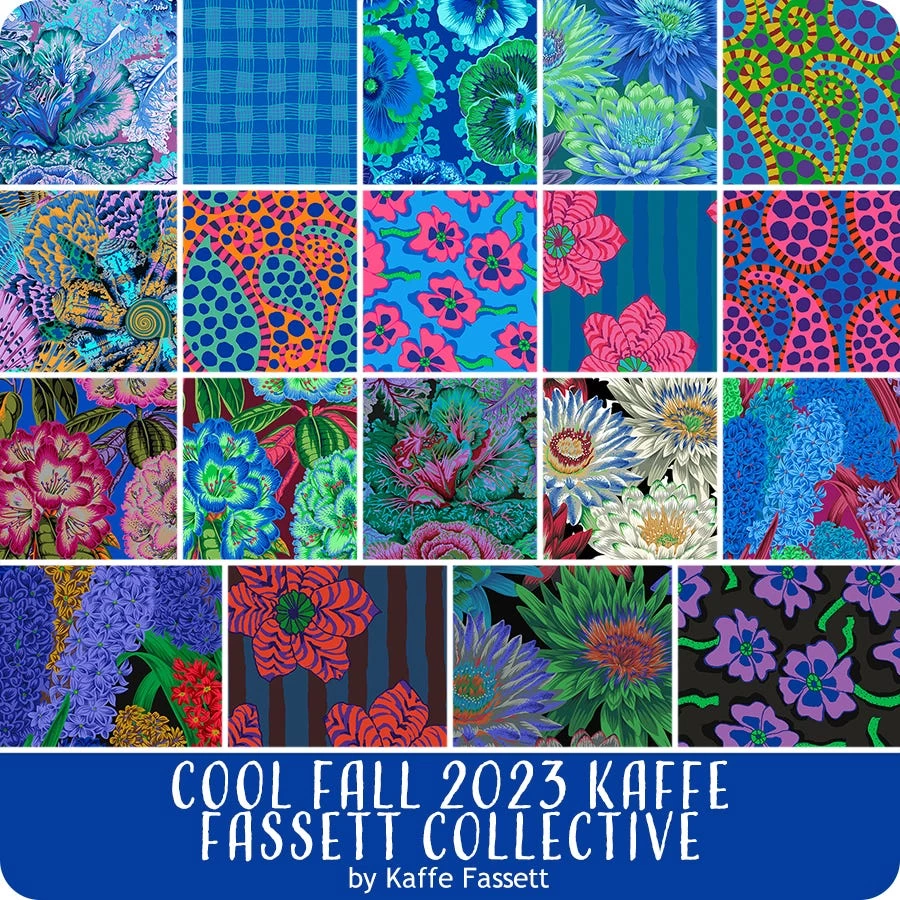 Cool Fall 2023 Kaffe Fassett Collective Charm Pack includes 42 5" squares and includes duplicates of some prints <br><br> <p>The <a title="Kaffe Fassett Collective" href="https://www.fatquartershop.com/free-spirit/kaffe-fassett-fabric">Kaffe Fassett Collective</a> has been inspiring us for years with Fassett’s distinct blend of bold color and composition. The patterns he uses are simple but incredibly graphic and uniquely Kaffe! Refreshing floral mosaics and geometric designs in chilly blues, greens and purples which clash in the beautiful cacophony of the Collective.</p>