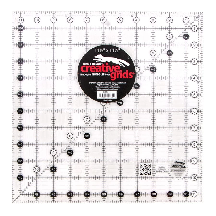 Creative Grids 11.5" Quilting Square Ruler features easy to read black and white markings printed in 1" grids marked in .125" and .25" increments. Ruler size: 11.5" square This item will ship in a box.