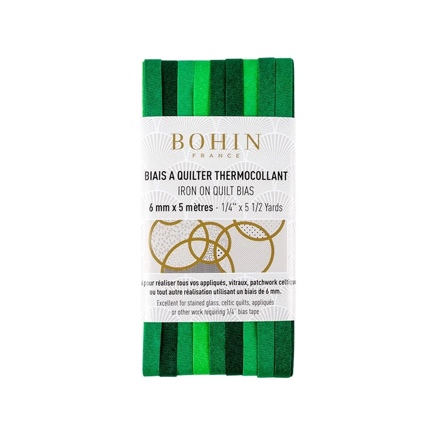 Dark Green Gradation Fusible Quilt Bias is perfect for quilts, bags, garments or applique. This 100% cotton-fusible bias is easy to use; simply remove the protective paper backing as you position it to your liking and then fuse it into place using your iron.