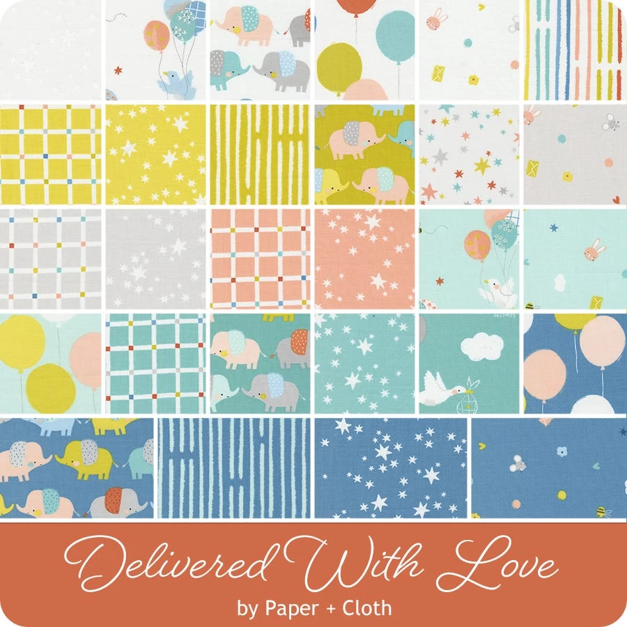 Delivered with Love Charm Pack includes 42 5" squares and includes duplicates of some prints <p> </p> <p id="DULARHD">Welcome the <a tabindex="0" href="https://www.fatquartershop.com/baby-and-children-quilt-fabric">newborn</a> into this world with this collection by <a tabindex="0" href="https://www.fatquartershop.com/paper-and-cloth-moda-fabrics">Paper + Cloth</a>. <a tabindex="0" href="https://www.fatquartershop.com/moda-fabrics/delivered-with-love-paper-and-cloth-moda-fabrics">Delivered with Love</a> and a wonderful selection of fabrics filled with fun <a tabindex="0" href="https://www.fatquartershop.com/animal-quilt-fabrics">animals</a>, pretty balloons and exciting geometric shapes. Pair these prints with the coordinating <a tabindex="0" title="Bella Cottons Solids" href="https://www.fatquartershop.com/moda-fabrics/bella-solids-moda-fabrics-quilting-fabrics">Bella Cottons Solids</a> from <a tabindex="0" title="Moda Fabrics" href="https://www.fatquartershop.com/moda-fabrics">Moda Fabrics</a> for some long-lasting projects!</p>