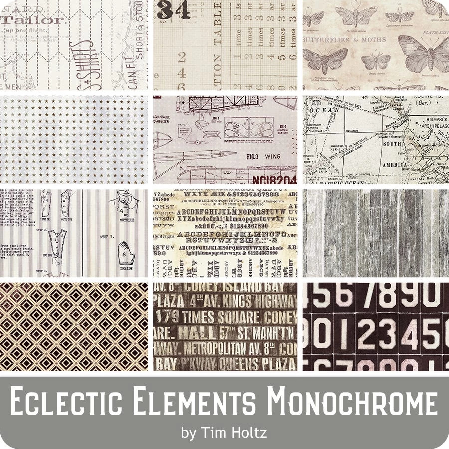 A collection of reprints of some of the best in muted tones from Tim Holtz’ Eclectic Elements collections. Gray and light tan hues of parchment, charcoal and linen provide a backdrop for classic and delightfully eerie imagery — scuffed hardwood floors, vintage typography, subway sign text, little stars and butterfly diagrams.