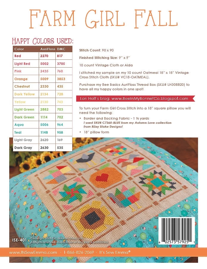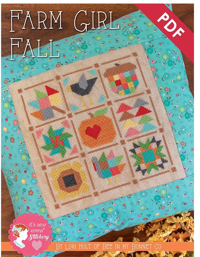 Farm Girl Fall Downloadable PDF Cross Stitch Pattern comes with full-color instructions, diagrams and supply list, including suggested DMC and AuriFloss colors. The cross stitch is designed to work on 10-count cloth and finishes at 9” x 9”. As a fun added bonus Lori finished her cross stitch out on an 18” square pillow and instructions are also included.