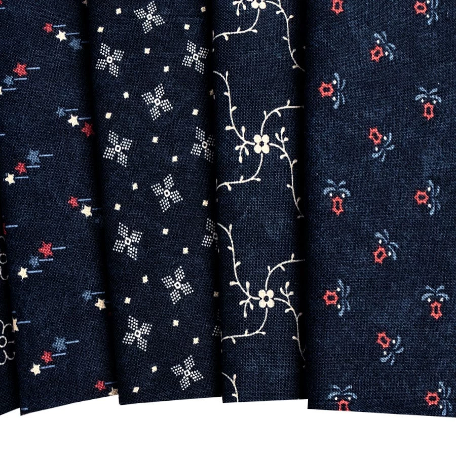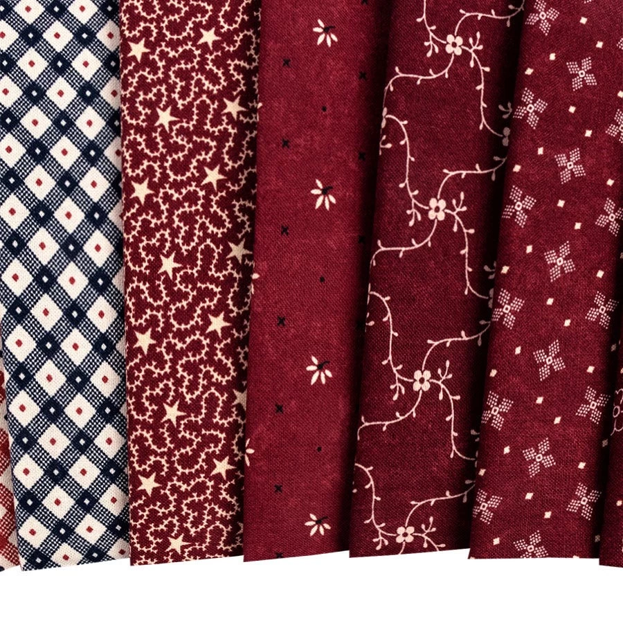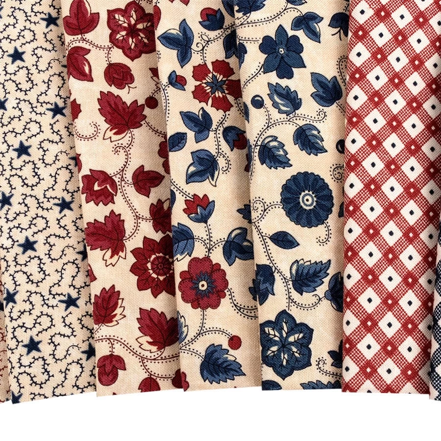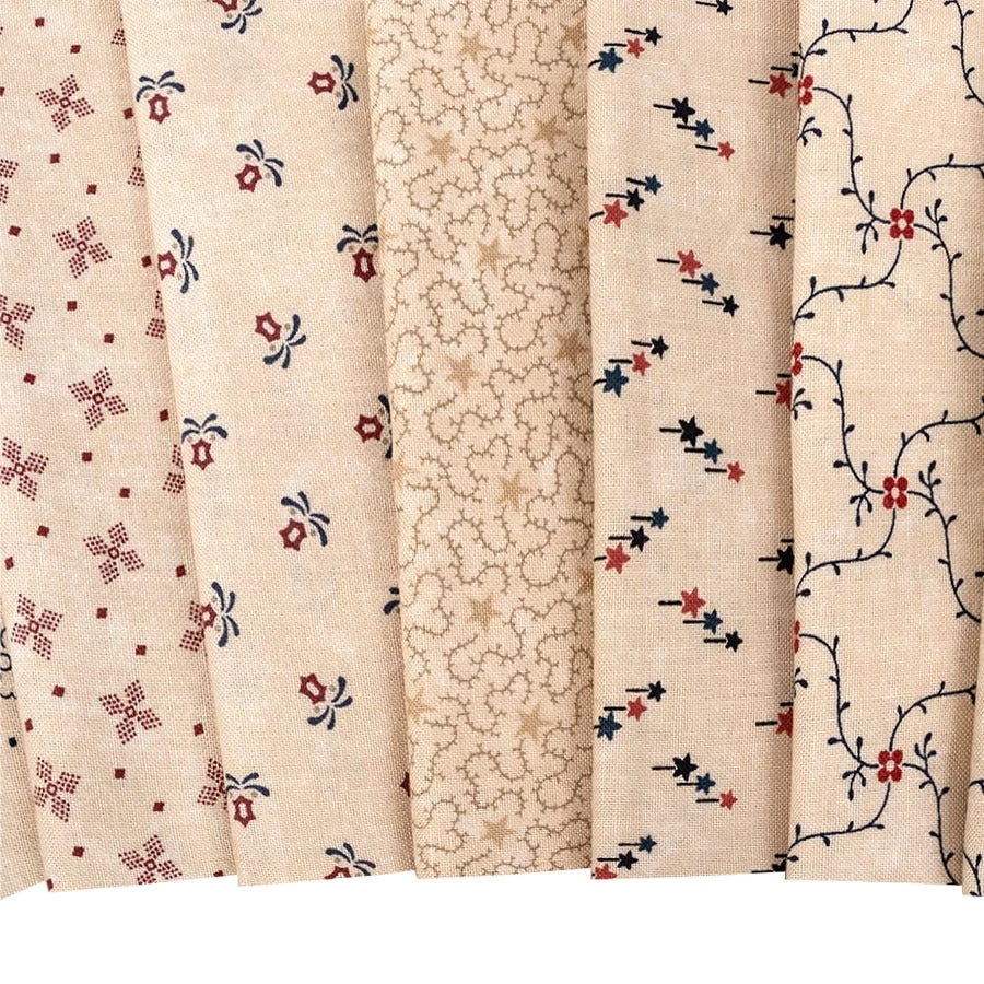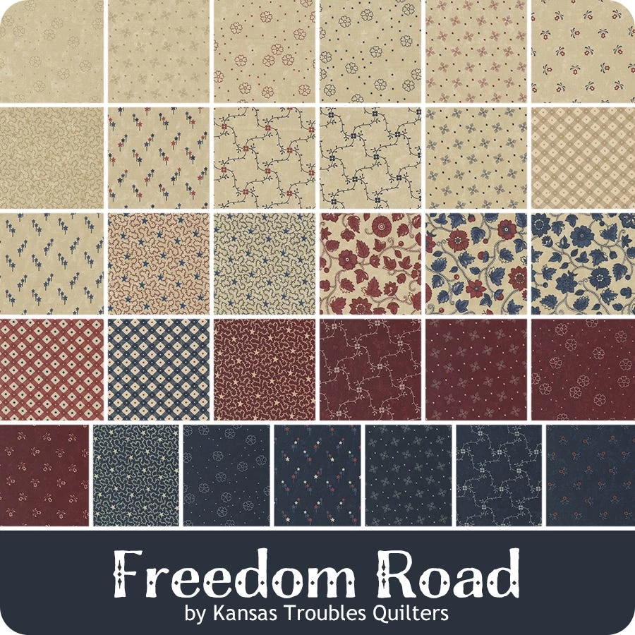 Let freedom ring with Freedom Road! Neutral and earth tones set the stage for florals and stars in this traditional assortment from Kansas Troubles Quilters. Precise and fine details are the hallmark of these beautiful designs! Pair these prints with corresponding Bella Solids from Moda Fabrics for some patriotic projects!
