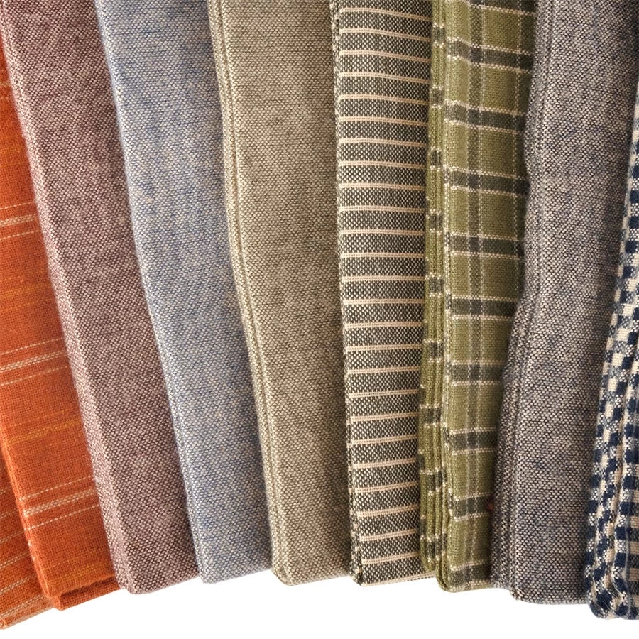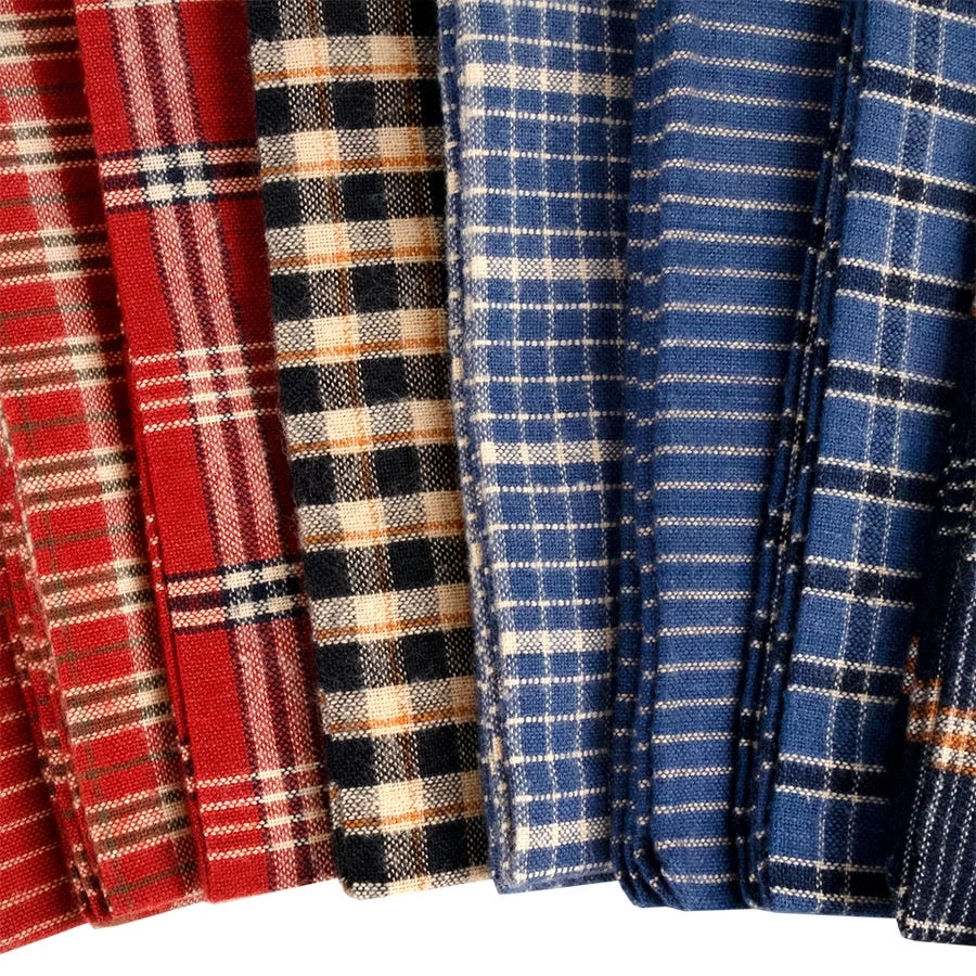 Enjoy a collection of warm prints inspired by the designers’ homemade tradition. Snuggle up with this set of red, orange, blue and green plaids, dug out of the Kansas Troubles Quilters’ closet and prepared for you to make your own cozy winter blanket.