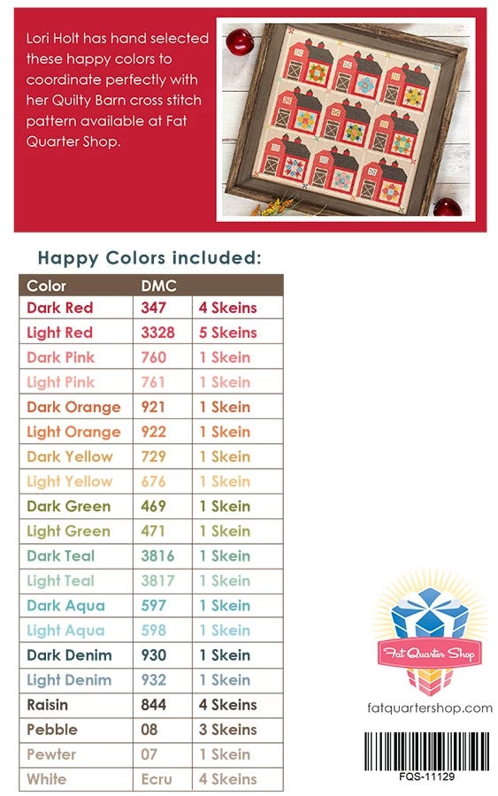 A set of 35 DMC six-strand embroidery floss (8.7 yards each), hand selected by Lori Holt to coordinate with her Quilty Barn Cross Stitch Pattern.