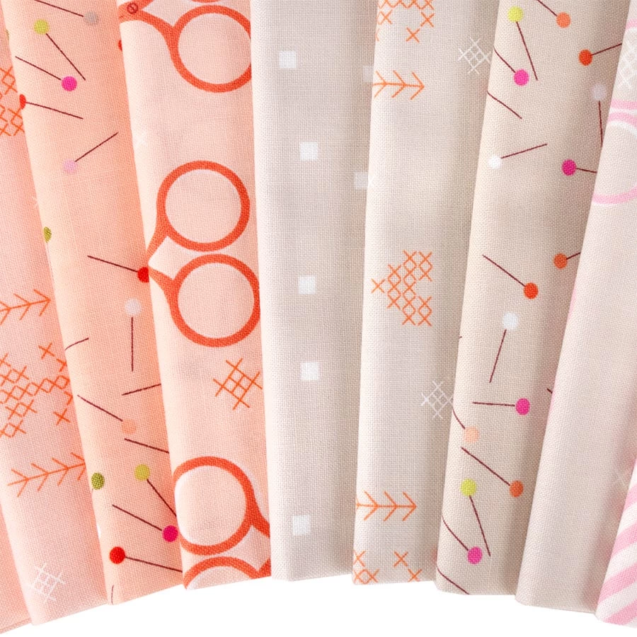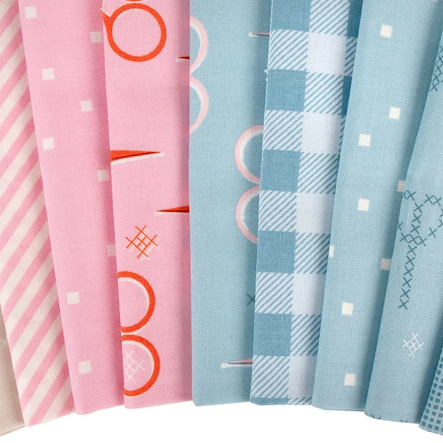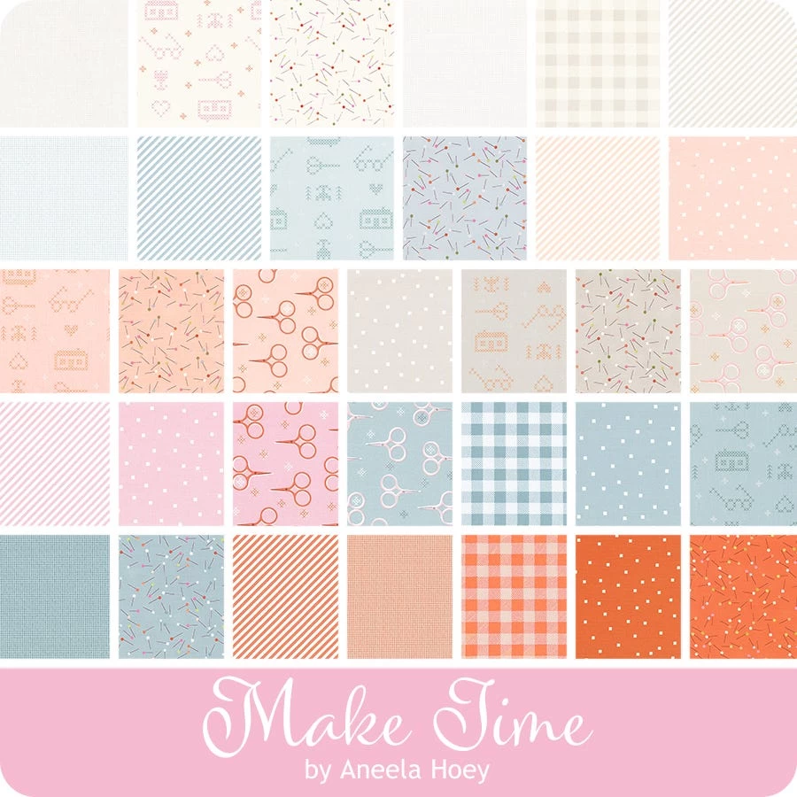 Make Time by Aneela Hoey alludes to your passions with its various designs. Fabric scissors, cross stitches, pins and so much more decorate backdrops of denim blue, orange, pink, gray and white. Pair these prints with the corresponding Bella Cottons Solids from Moda Fabrics to create some classic projects!
