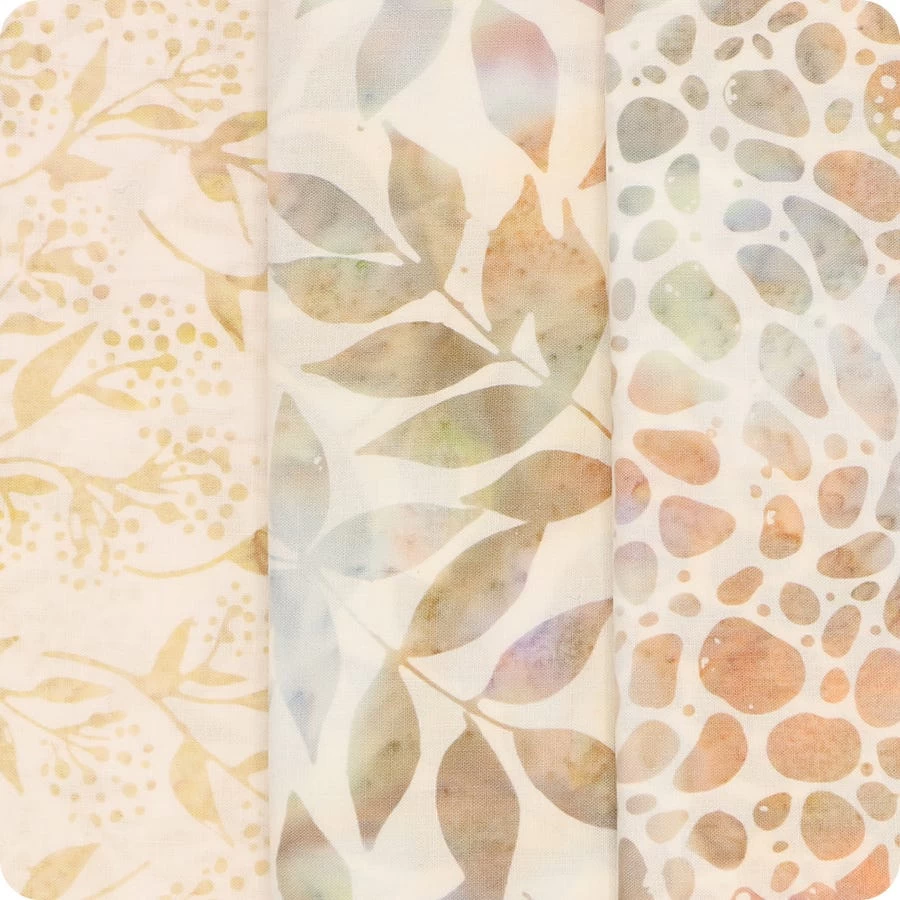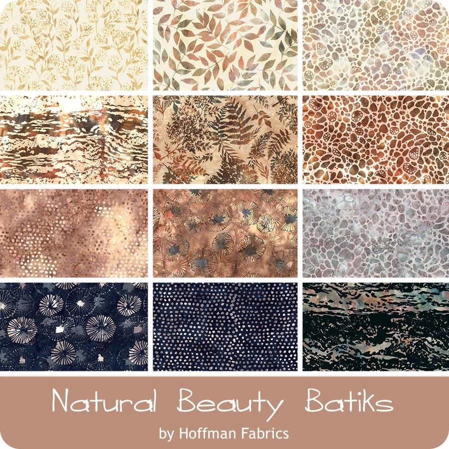 Natural Beauty Batiks Fat Quarter Bundle includes 12 fat quarters. <br/><br/> Price will be $41.98. <br/><br/> Expected ship date of August 2023. <br><br> Bring out the hidden loveliness in any project with this collection. Using the wonderful hand-dyed <a tabindex="0" href="https://www.fatquartershop.com/batik-fabric">batik</a> process, the <a tabindex="0" href="https://www.fatquartershop.com/hoffman-fabrics/natural-beauty-batiks-hoffman-fabrics">Natural Beauty Batiks</a> is a delightful array of fabrics decorated with exquisite patterns paired with neutral as well as bold colors. Pair these prints with the coordinating <a tabindex="0" href="https://www.fatquartershop.com/hoffman-fabrics/hoffman-1895-bali-batik-watercolors-solids-fabric">1895 Batik Bali Watercolors</a> from <a tabindex="0" href="https://www.fatquartershop.com/hoffman-fabrics">Hoffman Fabrics</a> to create some gorgeous projects!