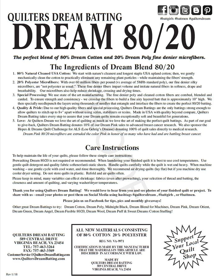 Natural Dream Batting by Quilter's DreamFeatures:80% Cotton and 20% Poly BlendMicrofibers imitate the softness and breathability of natural fibers, resisting wrinkles, reducing shrinkage and adding a touch of volumeNo resins, scrim or bindersStitch as closely as you would like or up to 8" apartNo need to prewash. Minimal shrinkage.Size: 60" x 30 yardsShipping note: This product ships separately from a third party, typically in 5-10 business days. Item cannot be shipped to P.O. boxes, Hawaii, Alaska or outside the contiguous U.S. Also, it cannot be shipped internationally. Not eligible for express shipping.