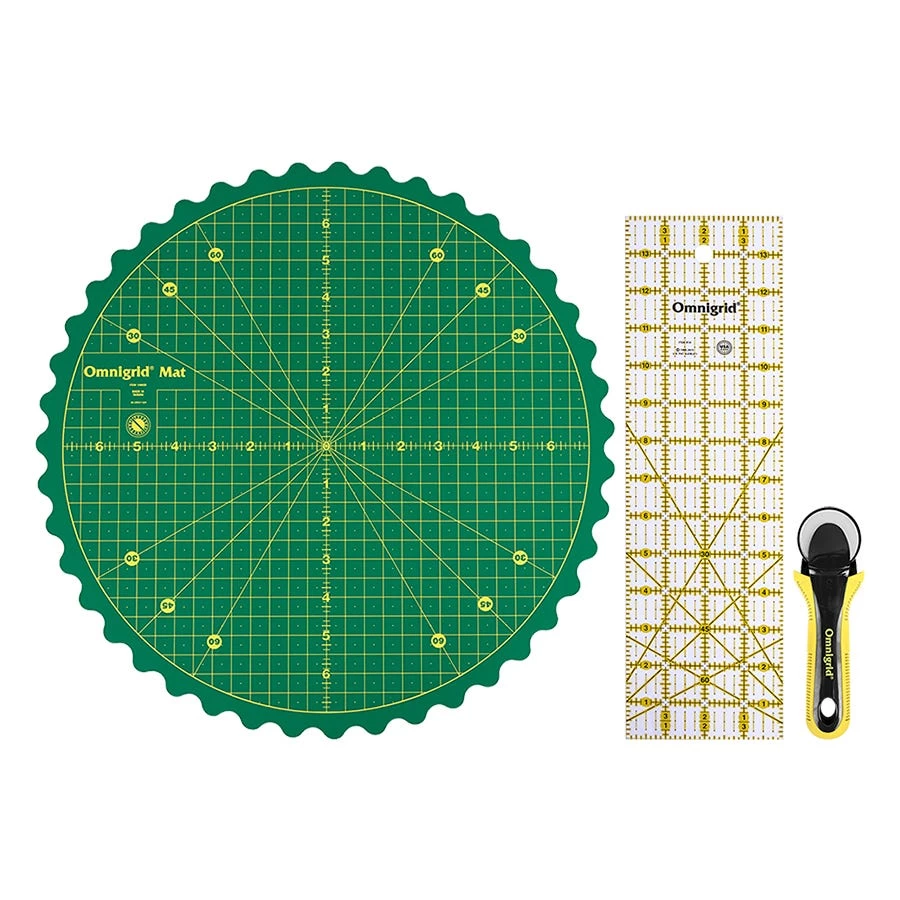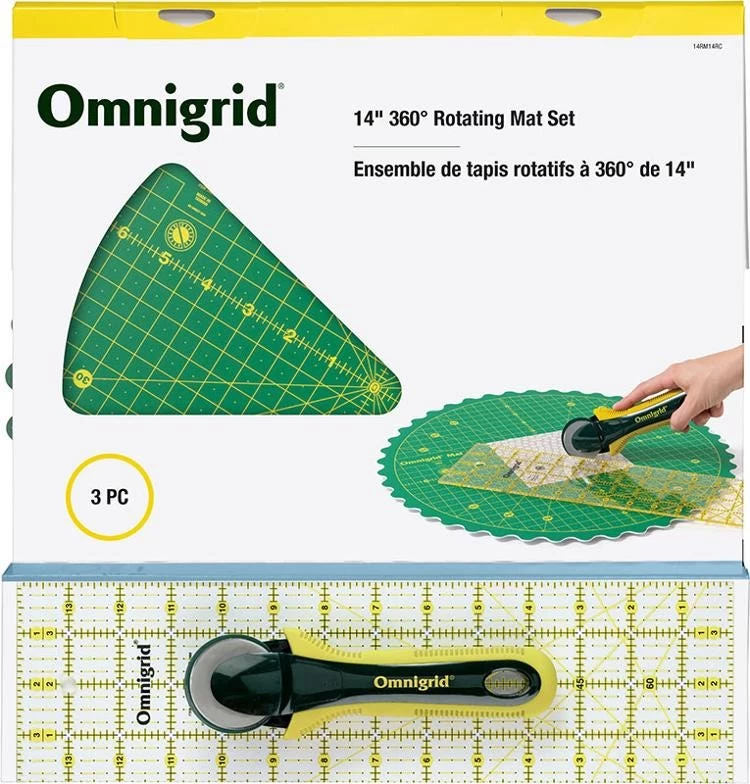 Omnigrid 14″ Rotating Cutting Mat Set makes cutting and piecing for your projects quick and easy. The 45mm rotary cutter, 4″ x 14″ ruler and self-healing, rotating cutting mat allows you to cut fabric, paper and more without moving the material or yourself, allowing you to make your cuts in less time and with less fatigue.
