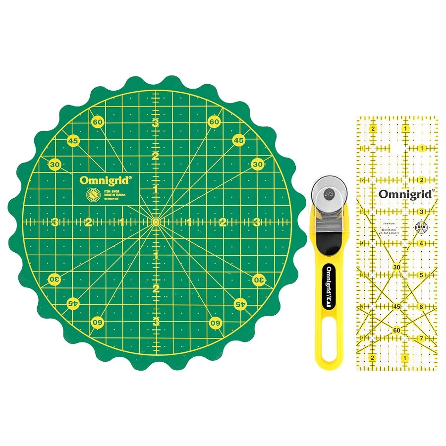 Omnigrid 8″ Rotating Cutting Mat Set makes cutting and piecing for your projects quick and easy. The 28mm rotary cutter, 2.5″ x 8″ ruler and self-healing, rotating cutting mat allows you to cut fabric, paper and more without moving the material or yourself, allowing you to make your cuts in less time and with less fatigue.