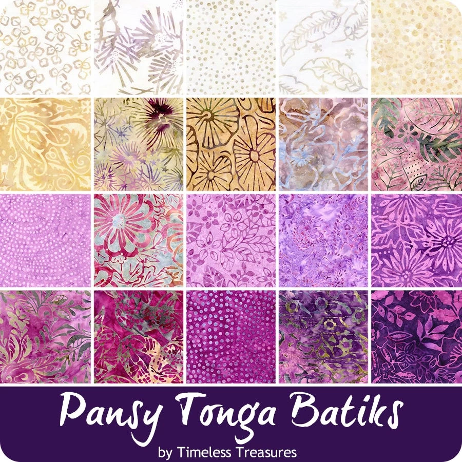 Pansy Tonga Batiks Treat Shortcake includes 42 10" squares and includes duplicates of some prints <br><br> Is purple your favorite color? Look no further than this collection right here! <a href="https://www.fatquartershop.com/timeless-treasures/pansy-tonga-batiks-timeless-treasures-fabrics">Pansy Tonga Batiks</a> has marvelous hues and designs of florals and foliage created by using the time-honored <a tabindex="0" href="https://www.fatquartershop.com/batik-fabric">batik</a> technique. Pair these prints with others from <a tabindex="0" href="https://www.fatquartershop.com/timeless-treasures">Timeless Treasures Fabrics</a> to create some amazing projects!
