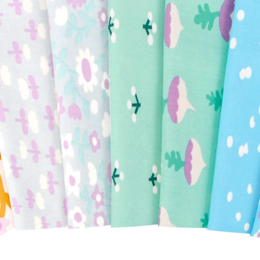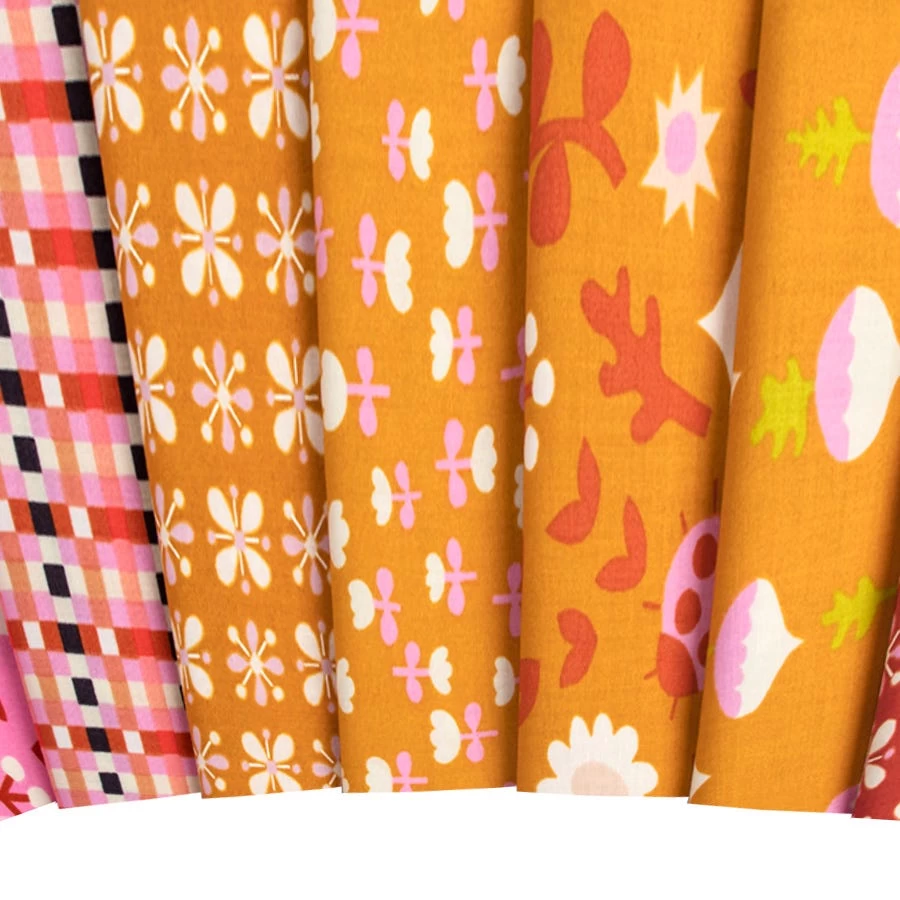 Lovely ladybugs, tossed flowers and turnips adorn Petunia, a contemporary floral collection from Ruby Star Society. Enjoy Kimberly Kight’s blooming blossoms, buds and geometric prints in a garden of pink, blue, teal, red and ochre hues.