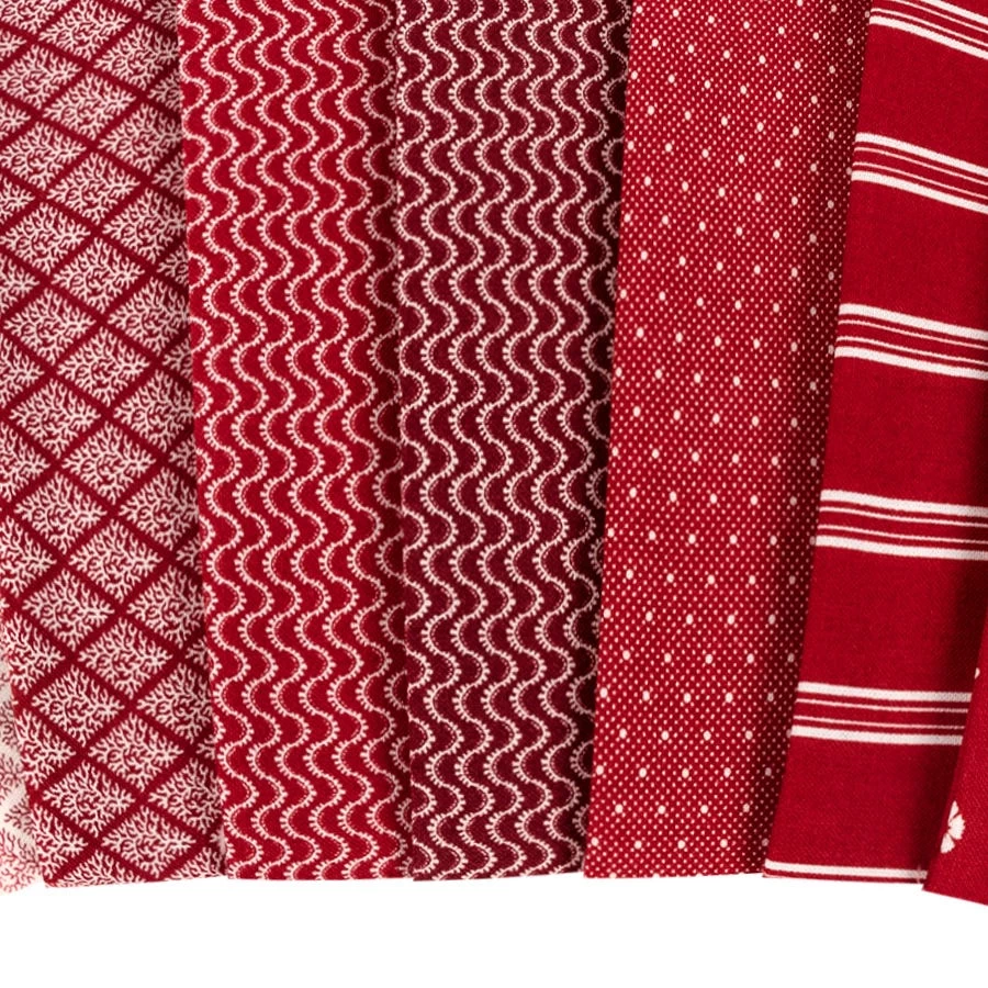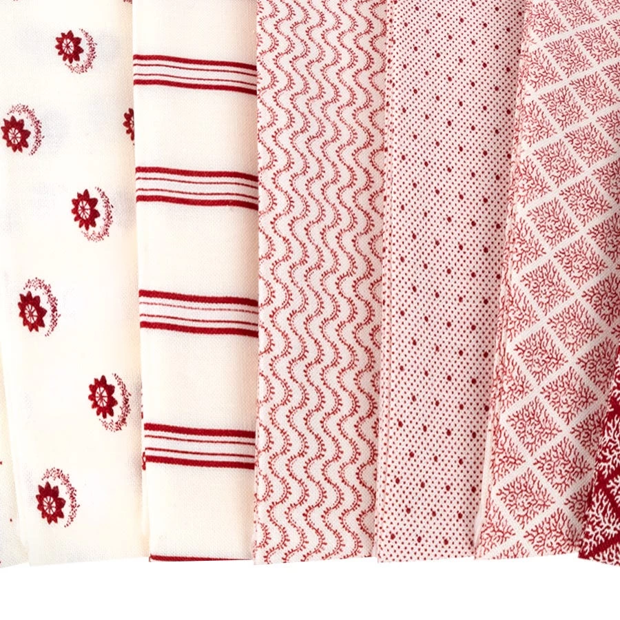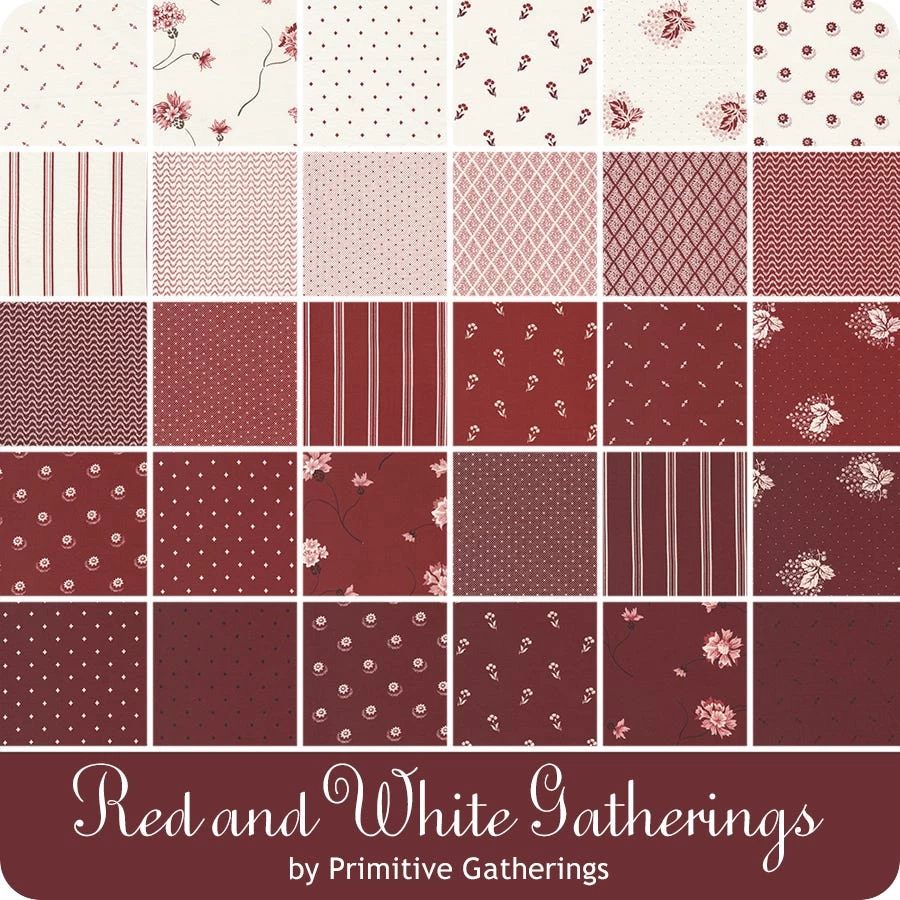Red and White Gatherings Jolly Bar includes 42 5" x 10" cuts of fabric and includes duplicates of some prints <br><br> Includes a free pattern to make the 64.5" x 64.5" quilt. <br><br>Fabric requirements for one Garnets Quilt Pattern:<BR><ul> <li>Two Red and White Gatherings Jolly Bars – SKU# 49190JB</li> <li>1.67 yards background, sashing & borders – SKU# 49197-11</li> <li>0.75 yards binding – SKU# 49194-11</li> <li>4.25 yards backing – SKU# 49192-11</li> </ul> <BR><BR> The smooth contrast of a passionate red meeting the edge of a neutral white makes this collection from <a tabindex="0" href="https://www.fatquartershop.com/primitive-gatherings-fabric-moda-fabrics">Primitive Gatherings</a> a statement in fabric aesthetic. Red and White Gatherings features many shades of <a tabindex="0" href="https://www.fatquartershop.com/redwork-bluework-quilting-fabric">red</a> ranging from maroon to burgundy and is sure to decorate your next project with a <a tabindex="0" href="https://www.fatquartershop.com/traditional-quilting-fabrics">traditional</a> elegance. Pair these prints with coordinating <a tabindex="0" href="https://www.fatquartershop.com/moda-fabrics/bella-solids-moda-fabrics-quilting-fabrics">Bella Solids</a> from <a tabindex="0" href="https://www.fatquartershop.com/moda-fabrics">Moda Fabrics</a> for your next chic design!