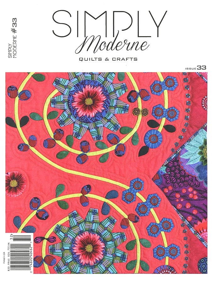 Simply Moderne Issue 33 brings you 11 beautiful projects showcasing bright and bold colors. Get a view of the delightful quilts displayed at the Atlanta QuiltCon. Meet Priscilla Bianchi and get to see some of her colorful creations.