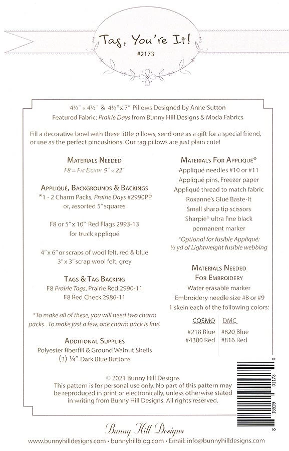 Tag You’re It! Pincushions Sewing PatternBunny Hill Designs #BHD-2173