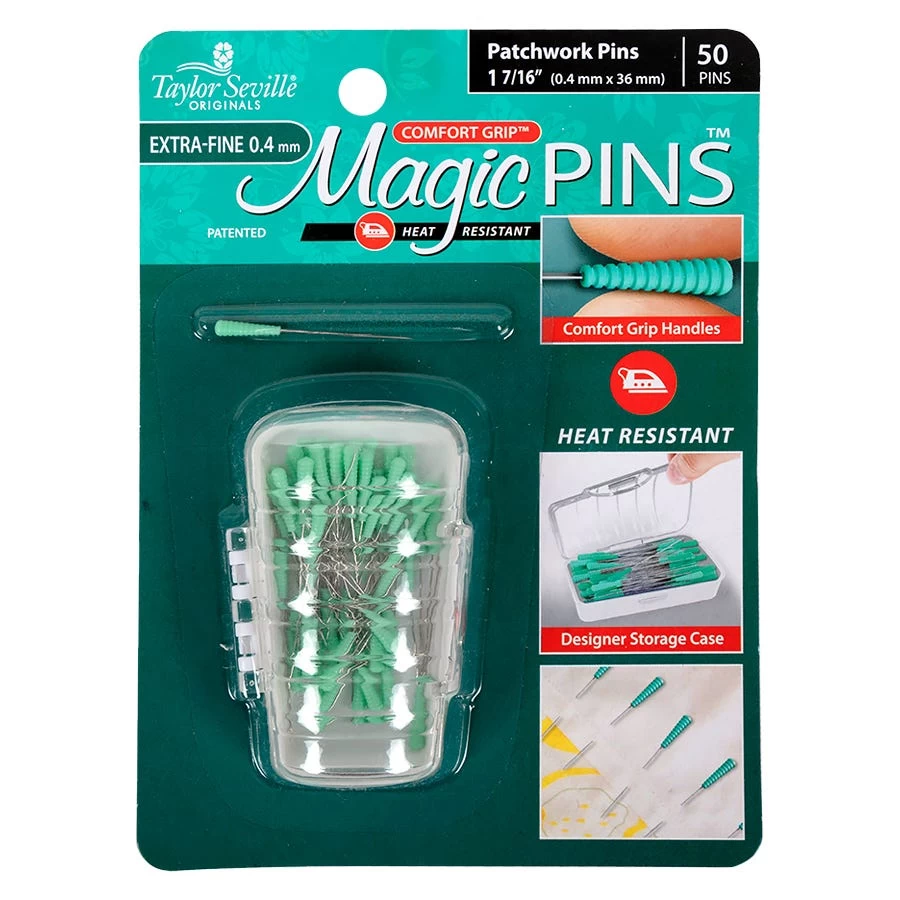 Taylor Seville's Extra Fine Patchwork Magic Pins have heat resistant comfort grip handles and are approximately 1.44” long. Package includes storage case and 50 0.4mm magic pins. Size: 0.4mm x 1.44"