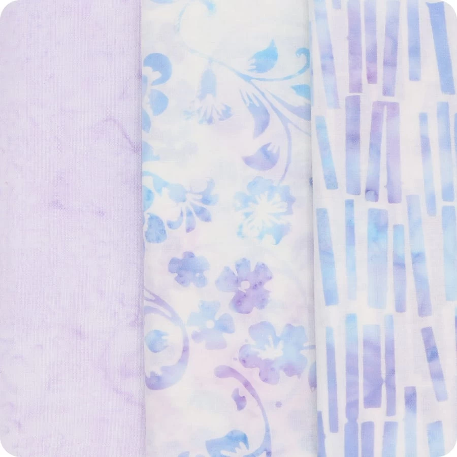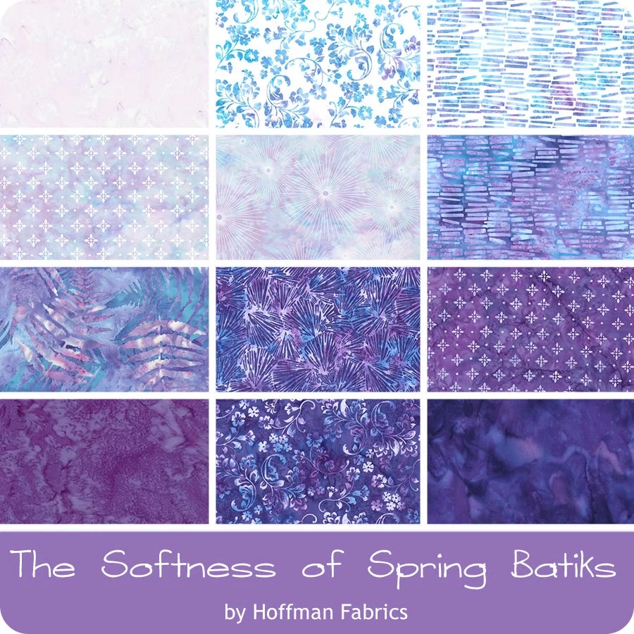 A gentle breeze is stirring in the Softness of Spring Batiks, a handcrafted, hand-dyed batiks collection from Hoffman Fabrics. Enjoy the blossoming buds and unfurling ferns of springtime, paired with refreshing dappled and geometric prints in cool blue, purple, lavender and white.