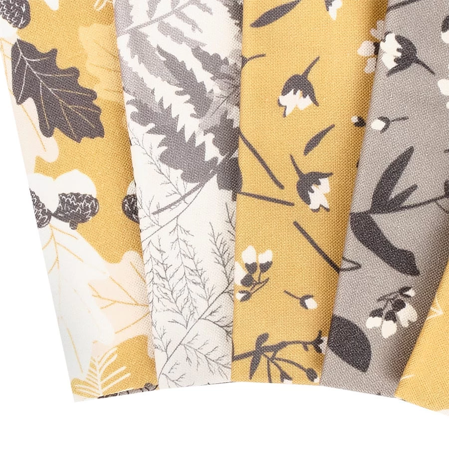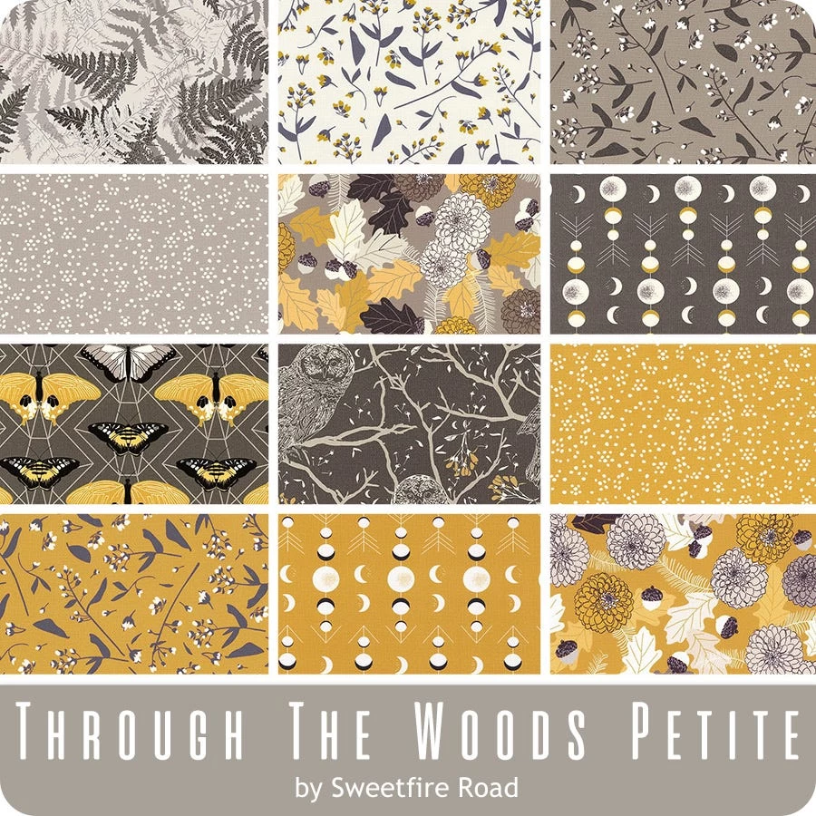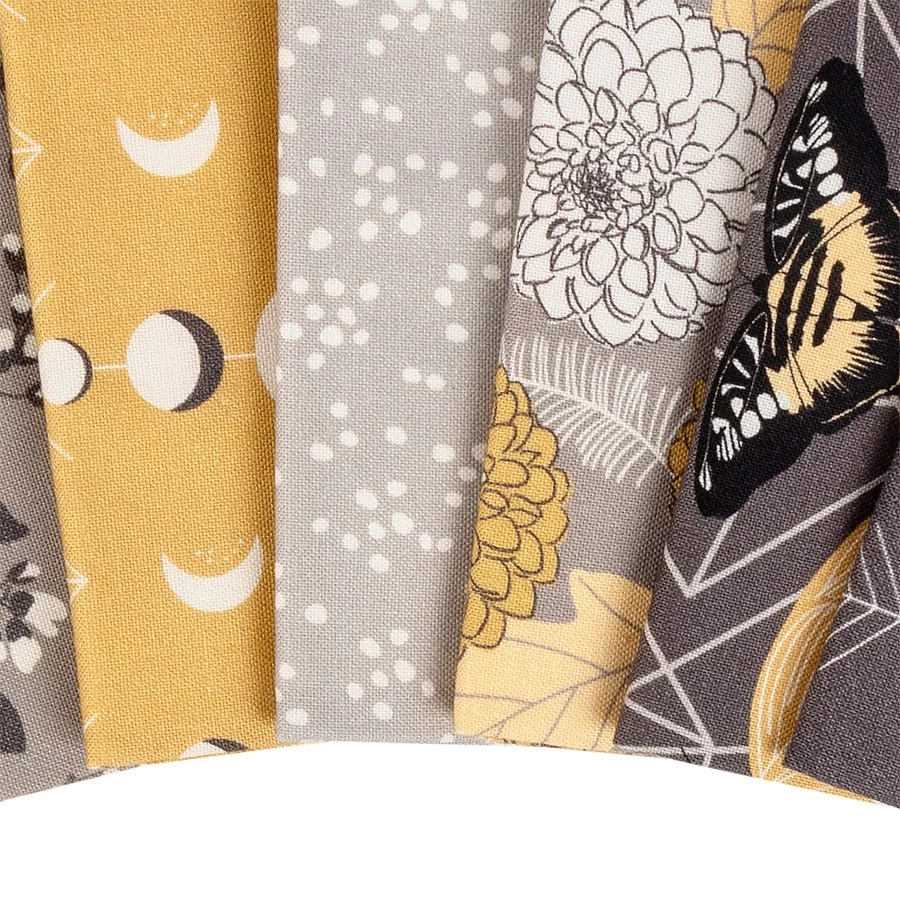 You can almost hear the crunching leaves below and the owls hooting in the distance with this collection full of forest images: Ferns, trees, flowers and moths in yellow, black, grey and white prints. Finally, all the lunar cycles of the moon to help you avoid getting lost in the woods! Pair these prints with the corresponding Bella Solids from Moda Fabrics to create some classic projects!