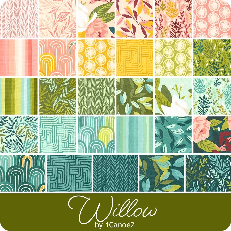 Willow Jelly Roll includes 40 2.5" x 42" strips of fabric and includes duplicates of some prints. <br/><br/> Price will be $44.98. <br/><br/> Expected ship date of December 2023. <br><br> Bring something fresh and new to your next arrangement of fabrics using this fantastic collection by <a tabindex="0" href="https://www.fatquartershop.com/one-canoe-two-moda-fabrics">One Canoe Two</a>. <a href="https://www.fatquartershop.com/moda-fabrics/willow-one-canoe-two-moda-fabrics">Willow</a> is a charming collection full of fun and interesting <a tabindex="0" href="https://www.fatquartershop.com/geometric-fabric">geometric</a> designs and thriving <a tabindex="0" href="https://www.fatquartershop.com/foliage-quilt-fabric">foliage</a>, that is paired beautifully with bright and unique hues! Pair these prints with the coordinating <a tabindex="0" title="Bella Cottons Solids" href="https://www.fatquartershop.com/moda-fabrics/bella-solids-moda-fabrics-quilting-fabrics">Bella Cottons Solids</a> from <a tabindex="0" title="Moda Fabrics" href="https://www.fatquartershop.com/moda-fabrics">Moda Fabrics</a> for some fabulous projects!