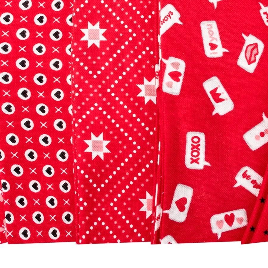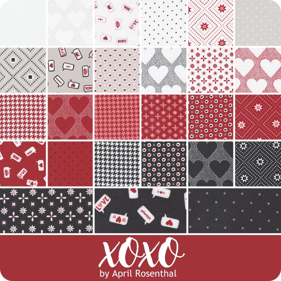 XOXO Fat Eighth Bundle includes 27 fat eighths. <br/><br/> Price will be $63.98. <br/><br/> Expected ship date of November 2023. <br><br> Fall in love all over again with this fabulous collection by designer <a tabindex="0" href="https://www.fatquartershop.com/april-rosenthal-prairie-grass-patterns-moda-fabrics">April Rosenthal</a>. <a href="https://www.fatquartershop.com/moda-fabrics/xoxo-april-rosenthal-moda-fabrics">XOXO</a> is a stunning <a tabindex="0" href="https://www.fatquartershop.com/valentines-day-quilting-fabrics">Valentine’s Day</a> themed collection with hearts, dots and geometric patterns that are colored in spectacular shades of red, pink and a little bit of black. Pair these prints with the coordinating <a tabindex="0" title="Bella Cottons Solids" href="https://www.fatquartershop.com/moda-fabrics/bella-solids-moda-fabrics-quilting-fabrics">Bella Cottons Solids</a> from <a tabindex="0" title="Moda Fabrics" href="https://www.fatquartershop.com/moda-fabrics">Moda Fabrics</a> for some beautiful projects!